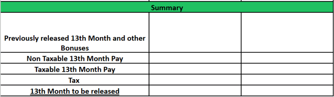 The Summary section provides a high-level breakdown of 13th Month computation results after accounting for previously released amounts and applicable taxes.