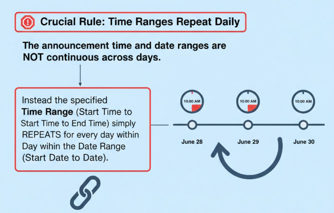 The announcement time and date ranges are NOT continuous across days. Instead, the specified Time Range (Start Time to End Time) simply REPEATS for every day within the Date Range (Start Date to End Date).