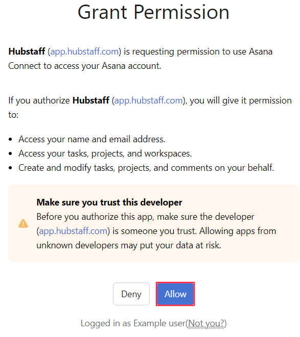 To integrate Hubstaff with your Asana account, you need to grant access through oAuth and then, click Allow.