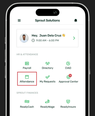 The Attendance page in Sprout Mobile lets you easily track your clock in/out logs on the go. This feature mirrors what you see in Sprout HR, giving you quick access to your attendance records anytime.