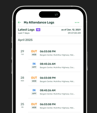The Attendance page in the Sprout Mobile App lets you quickly view your clock in/out logs wherever you are. It mirrors the attendance records you see in Sprout HR, giving you fast, convenient access to your logs anytime you need them.