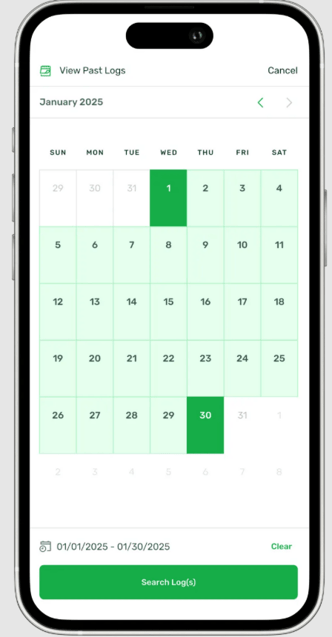 - Tap View Past Logs (calendar icon on the lower right) to access up to 31 days of records for a more detailed review.