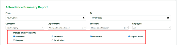 But, if I tick both checkboxes (Include employees with Absences and Tardiness), then the result will show Employee 1, Employee 2, and Employee 3.
