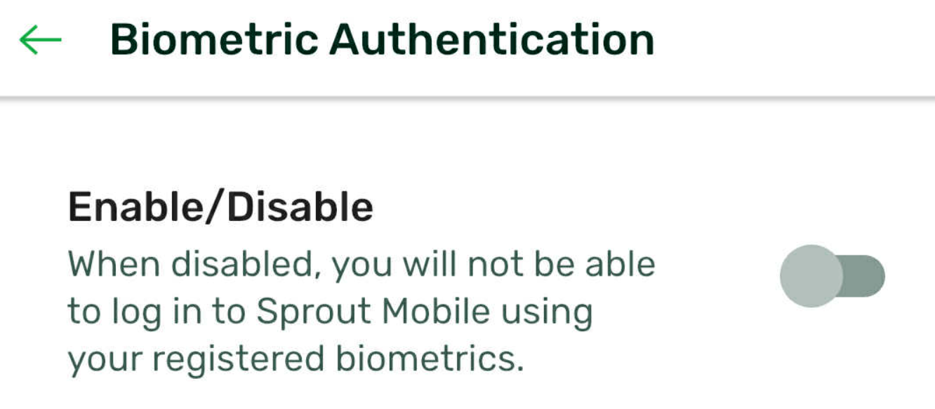 To turn on the Biometric Authentication to your mobile app, go to Settings > Biometric Authentication > Enable/Disable.