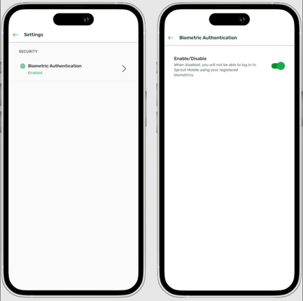 By default, all users, regardless of dashboard type, can use Biometric Authentication on their registered devices in the Sprout Mobile App. This feature supports both facial recognition and fingerprint authentication, depending on what your device is capable of.