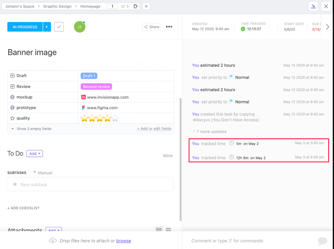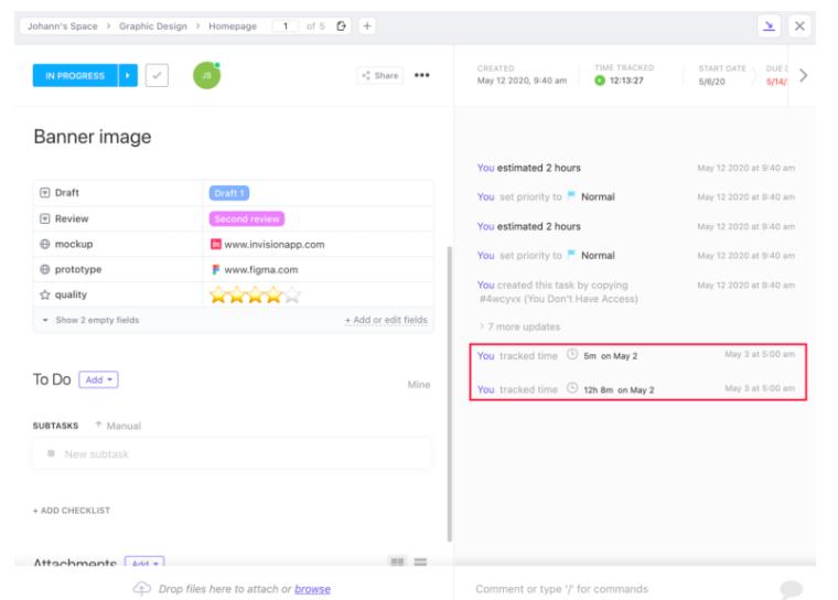 After tracking time to a ClickUp task, and depending on your integration’s time logging settings, the time will be written back to ClickUp as a comment: