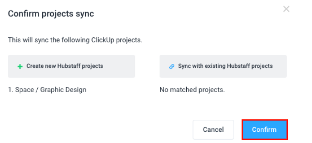 - Sync all – all projects are synced to Hubstaff, and if a project with the same name doesn’t exist, each new project will automatically be created and synced once you click on the Confirm button.