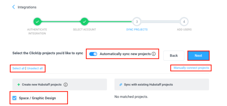 - Select from list – allows you to choose which projects to connect to Hubstaff. Check or uncheck project names on the left column. You can also enable the “Sync new projects daily” setting so all new projects are automatically linked to Hubstaff. You can also choose to manually sync projects. Choose either “Select All,” or “Unselect All,” or manually choose each project you wish to link to Hubstaff. Click on “Next” to move to the next step.