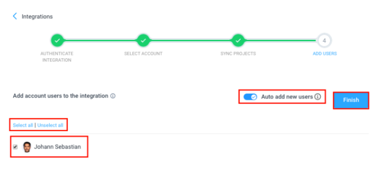 Next, you’ll need to connect users to your integration. Make sure the “Auto-add new users” option is enabled so that all new users added to Hubstaff are automatically added to your integration. You can also choose to “Select all,” “Unselect all,” or manually choose which users you want working on your integration. Click Finish to end the setup.