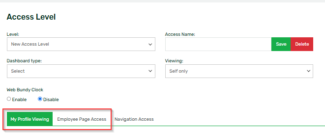 When creating or editing access levels, there are 2 tabs that pertain to an employee profile’s access level settings – My Profile Viewing and Employee Page Access.