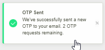 A success message is displayed indicating the number of remaining OTP requests you have left, and a new OTP is sent to your registered primary email address: