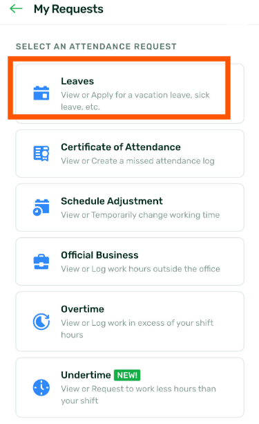 Step 2: On your ‘My Requests’ page, select ‘Leaves’.
