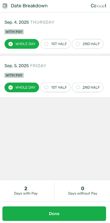 Step 5: On the Date Breakdown page, each date card can be set to Whole Day, 1st Half and 2nd Half. Based on your available leave credits, each date card will be automatically labeled With Pay or Without Pay.