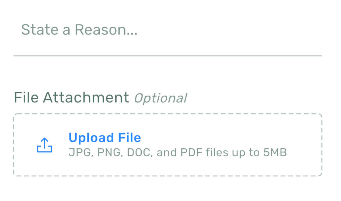 Step 6: On the application form, type the reason for the leave. Based on the leave policy, attaching a file may be optional or not. Acceptable file types are DOC, JPG, PNG, and PDF up to 5MB only.