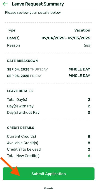 Step 7: The application request can be reviewed on the ‘Leave Request Summary’ page. When you’re done filling up the necessary details of your leave request, click ‘Submit Application’.