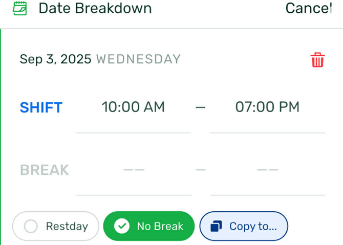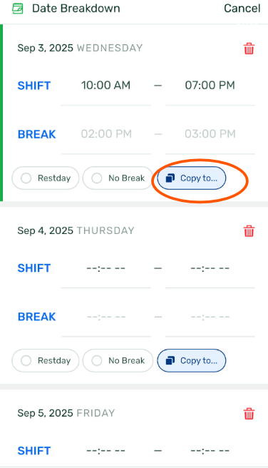 Step 4: Each date will have its own date cards, where shift start, shift end, break start, and break end can be typed. Click Copy To in order to apply a schedule from the date card to another.