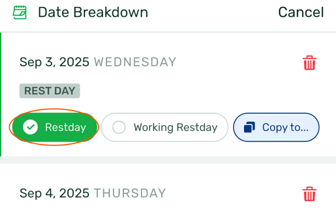 - To set a working day to Rest Day, click the button Rest Day check box.