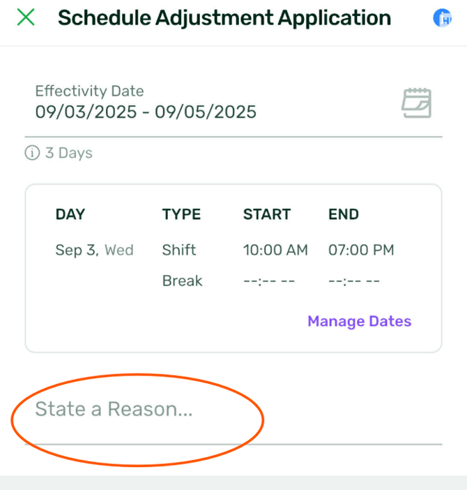 Step 5: On the application form, type the reason for Schedule Adjustment.