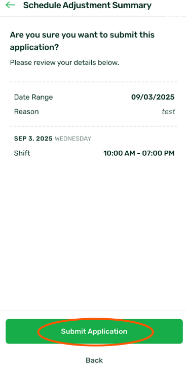 Step 6: The application request can be reviewed on the Schedule Adjustment Summary page. When done, submit by clicking Submit Application.