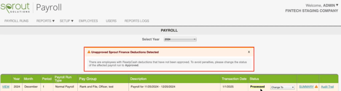 4. How will I know if the payroll run with ReadyCash/ReadyWage deductions is not yet approved?