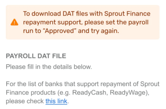 Ensure that the payroll run status is set to “Approved” to enable Payroll + RC/RW DAT file downloads. Upon downloading the file, it will trigger an email to Netbank (for RC) and Sprout (for RW) for possible repayment.