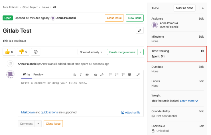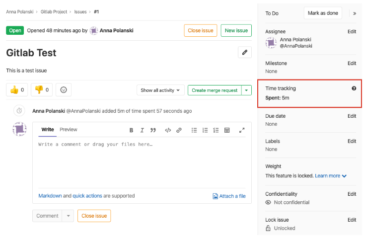 Time tracked to Gitlab issues from the Hubstaff app will sync back on the Time Tracking section of the issue page on Gitlab:
