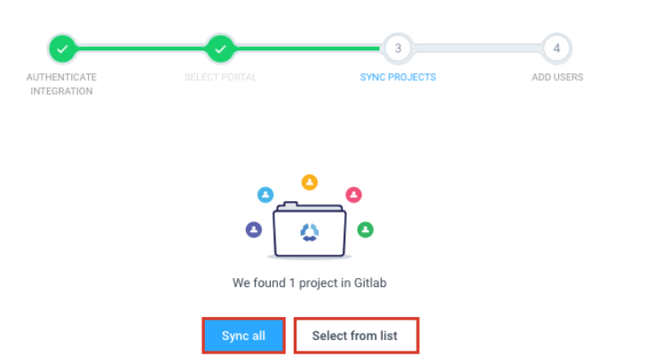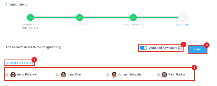 Next, you’ll need to select which team members you need to work on the integration. You have the option to select/unselect all users, select individual users, and/or to automatically add new users to your Gitlab integration. Click Finish to continue.