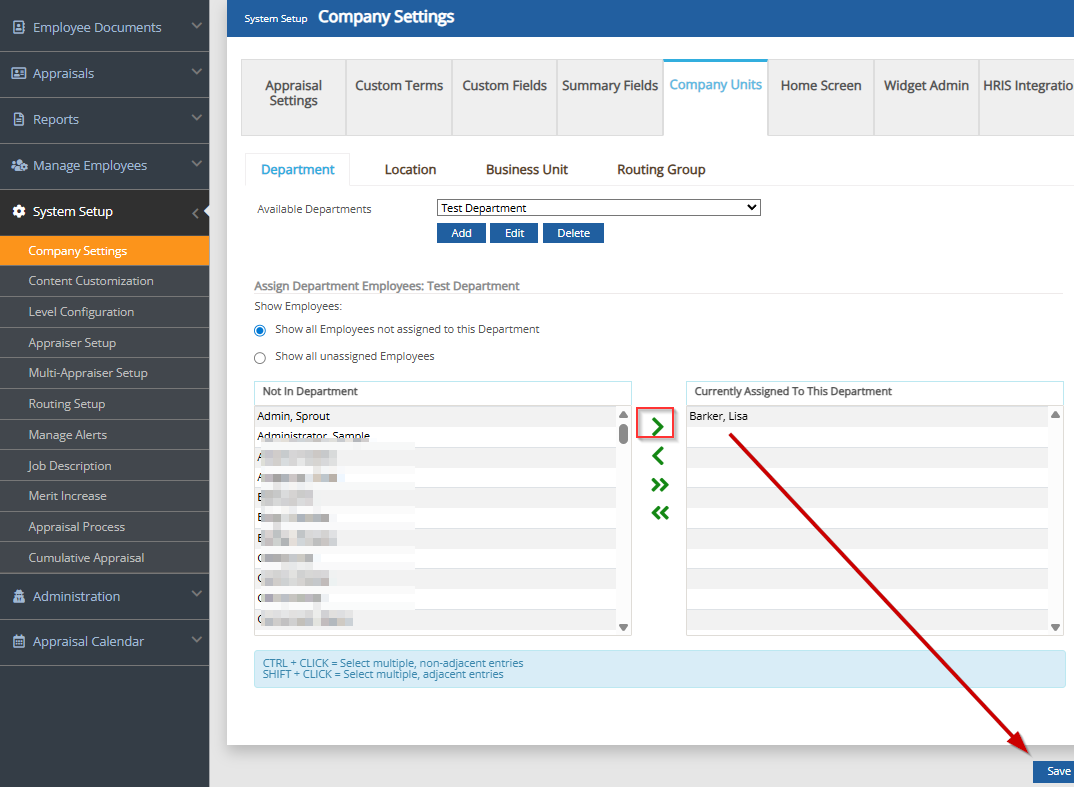 Move the Department Admin from the "Not in Department" table to the "Currently Assigned To This Department" table. Click Save.