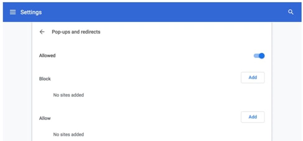 • To allow all sites to show pop-ups, select Allowed.   OR