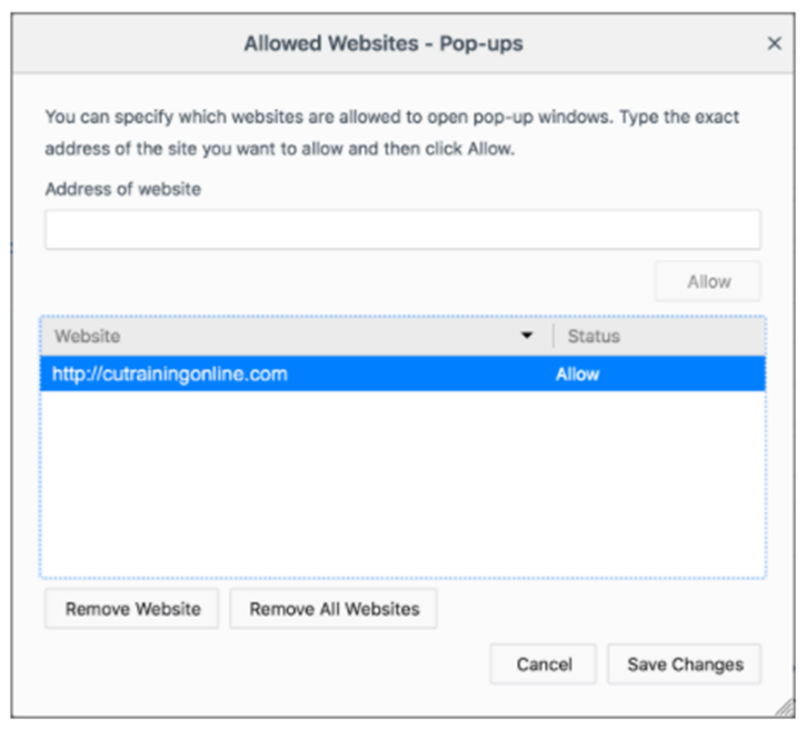 2. When the Allowed Sites – Pop-ups screen appears, enter cutrainingonline.com in the Address of website field, then select Allow.