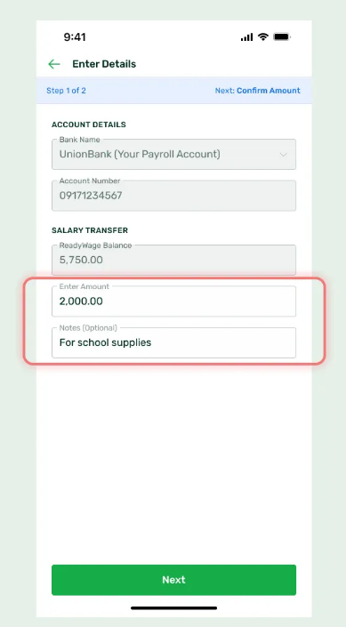 Enter the Amount you want to withdraw then click Next. You can add optional notes as well.