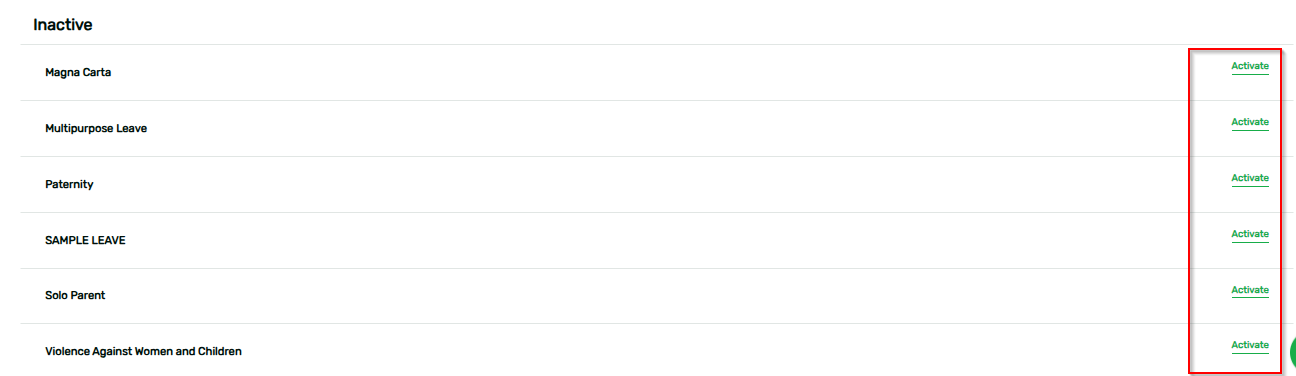 4. Scroll down to the Inactive Leave Types, then click the Activate button for the specific leave type you want to be activated.