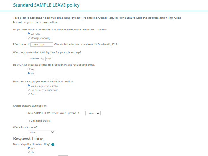 Vacation, Sick, and Birthday Leaves are automatically added to the system with the Default Leave Plan. These automatically assign all regular and probationary employees into the plan including new hires. You just simply need to activate these leave types.