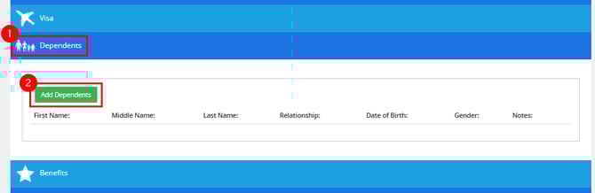 - Once you're in the employee profile, scroll down to find the Dependents tab. Click on it, then click the Add Dependents button.