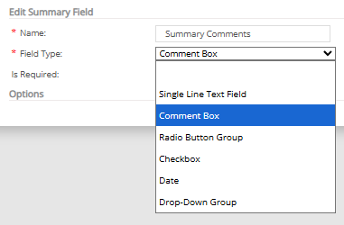 Please take note that the "Field Type" will show different field types such as Single Line Text Field, Comment Box, Radio Button Group, Checkbox, Date, and Drop-down Group.