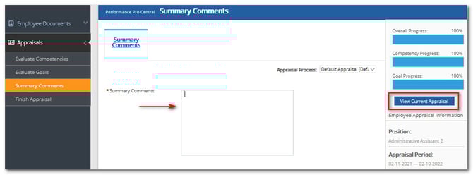 Summary Fields are the last page you'll need to answer before completing your appraisal. Usually, this is used to ask employees to summarize their experience or any information they like to communicate to the company. This field will appear under Summary Comments, as shown in the screenshot below.