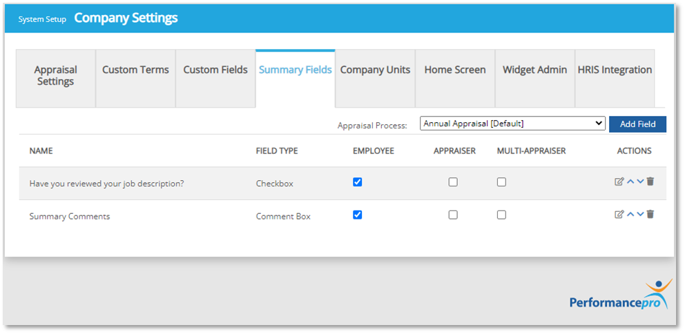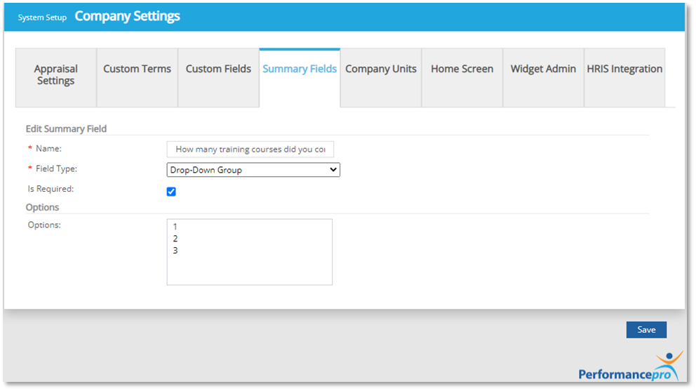 2. From the sub-menus above, click on " Summary Fields". First, you need to choose the Performance Assessment you would like to add a field to. Just click on the dropdown and click on the Performance Assessment. If there is an existing field, it will show on the lower portion, as shown in the second screenshot.