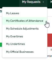 1. On the navigation bar on the dashboard, click the My Requests tab and choose My Certificates of Attendance from the drop-down list that appears.