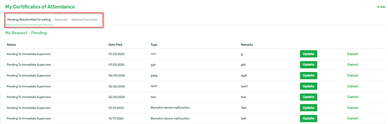 - Rejected/Cancelled - lists all filed applications which have been rejected or cancelled by your supervisor/manager/admin, or even by yourself.