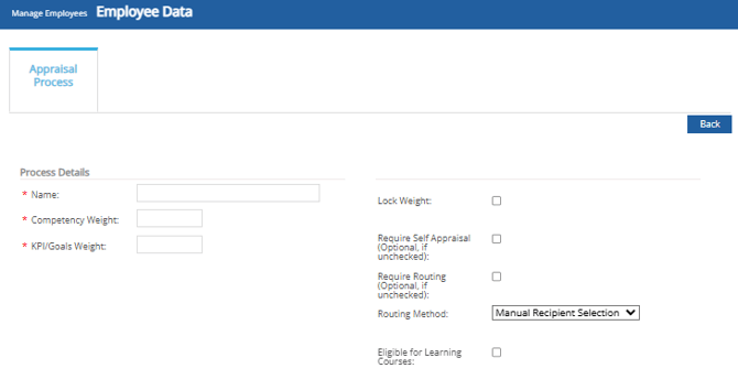 This portion lets you set the name of the appraisal, the competency, and the Goal weight. If you wish that no other appraiser can change the weight you can tick the Lock Weight box. If you require your employees to complete self-appraisal, please tick on Require Self performance Assessment checkbox. Also, if you wish to have the routing as part of the process of this appraisal, just ticked the box for Require Routing. You will then choose the routing method if its auto-routed, manual recipient, or manual path.