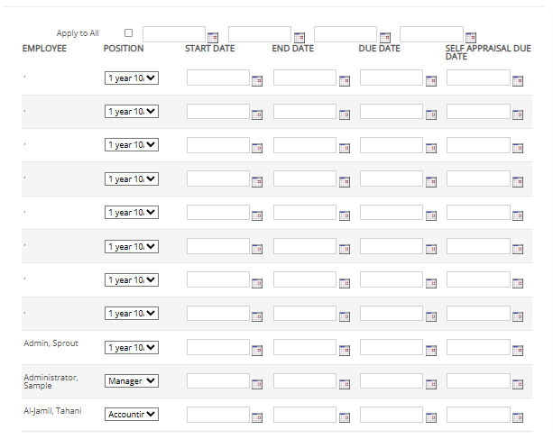Another pop-up will show for you to fill in the start date, end date, and due dates of the appraisal. If all employees have the same schedule you can tick the Apply to all box so it will auto-populate the information on all employees. Once done just hit on "Ok".