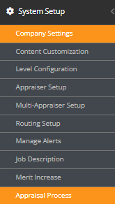 1. Under the Menu Section click on System Setup then, select Performance Assessment Process/Appraisal Process. The first thing you will see on your right is currently created appraisals. If you wish to have this duplicated, edited, or deleted, just click on the quick action icons on the right.
