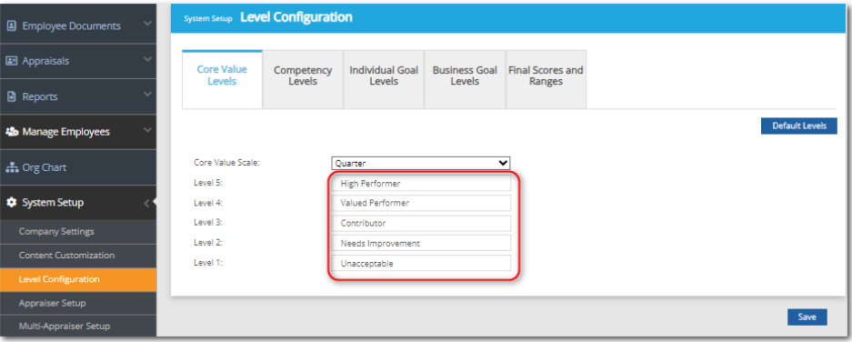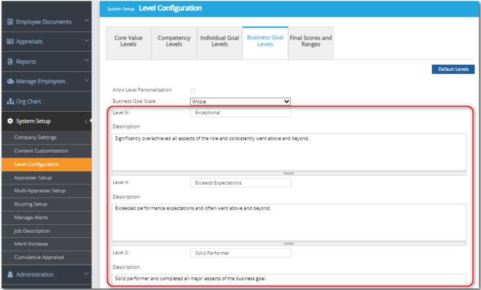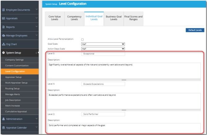 Reminder: Any customization of performance levels descriptions and ranges will apply to all appraisals in the system.