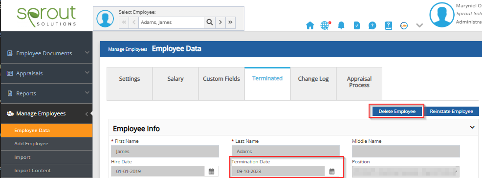 From the Performance+ dashboard, search for the terminated employee’s name and open their profile > Manage Employees > Employee Data.