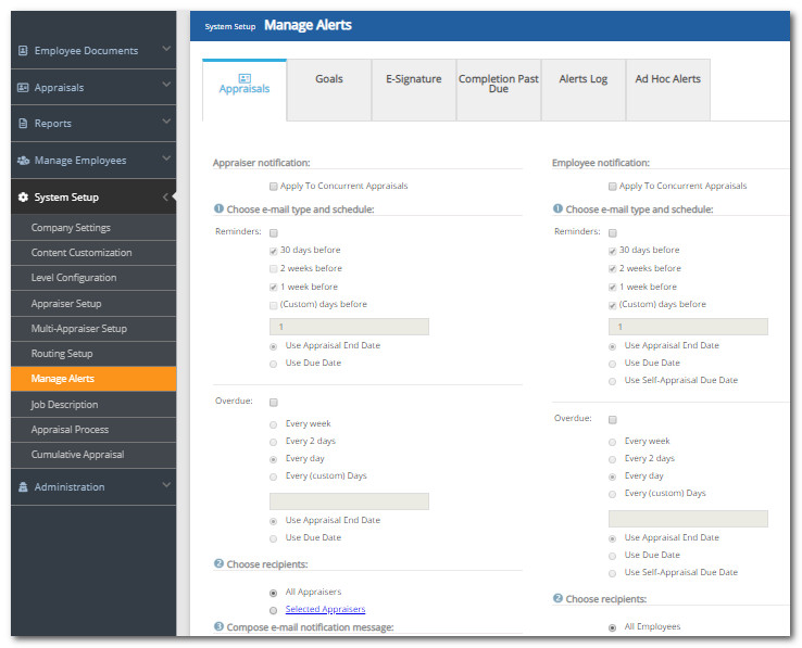 3. To disable the e-mail notifications for appraisals, you simply uncheck the desired reminders for Upcoming and/or Overdue alerts.