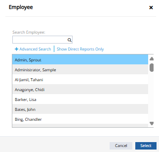 2. A pop-up will show; just choose an employee by searching for their name in the search bar or by scrolling through the list. Once you click the name of the employee, don't forget to hit on the "Select" button.