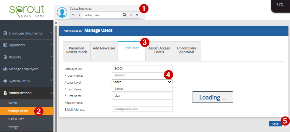 3. From the sub-menus below the Select Employee bar, click on "Edit User".
