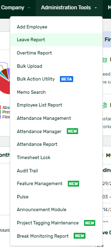 The Leave Report shows all the filed leaves of employees based on a selected date range, regardless of the status of the leave filing. One can find this under the Administrations Tools tab, by clicking Leave Report from the drop-down list that appears. To access it and to harvest data regarding leave filings, you can follow the steps given below: