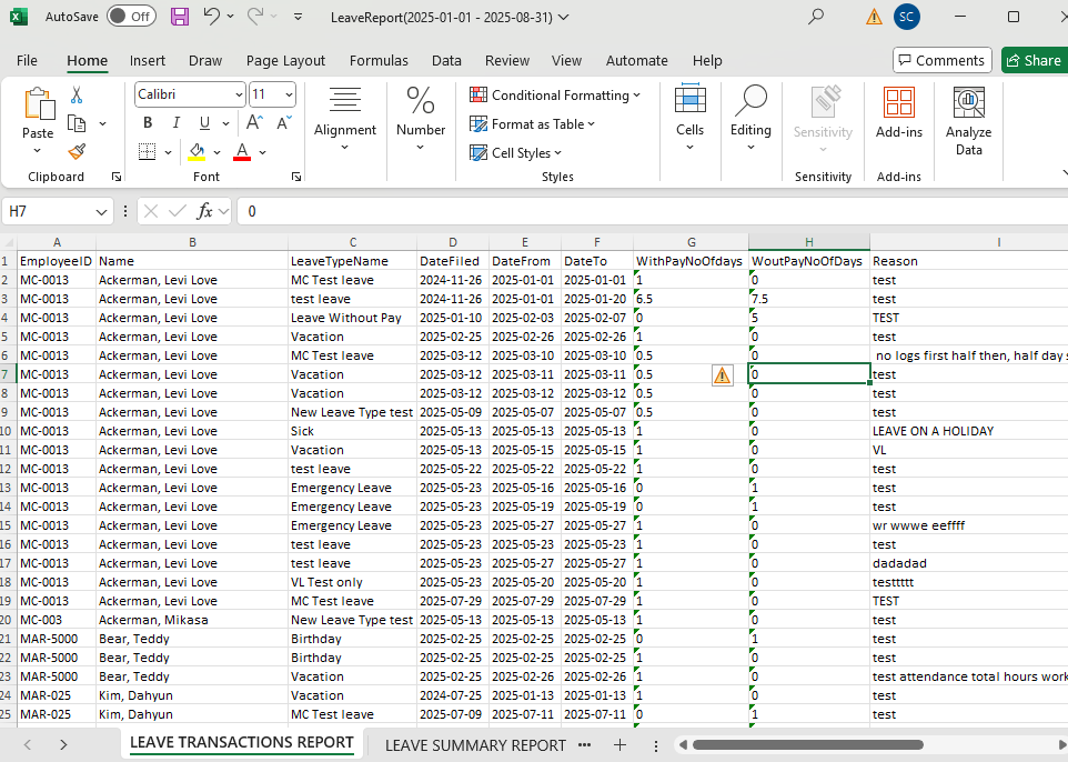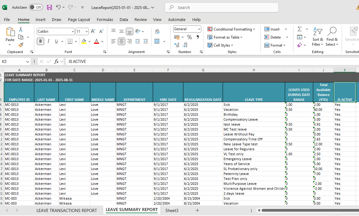 The report contains 2 sheets -- Leave Transaction Report and Leave Summary Report.