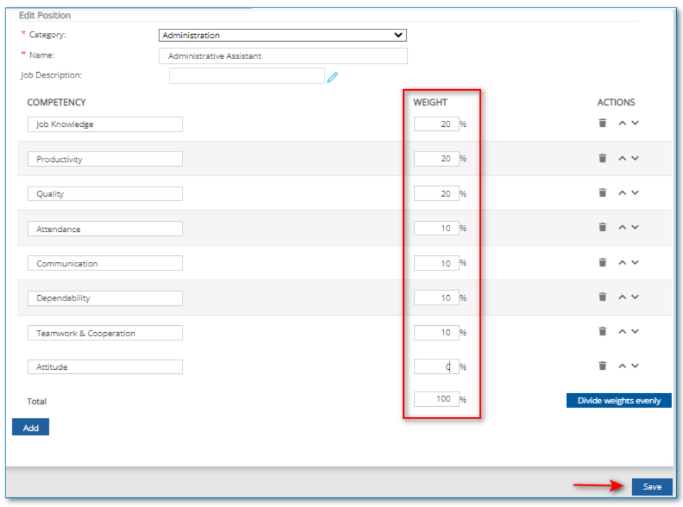 6. Lastly, adjust the weights between all Competencies to total 100% and click Save.